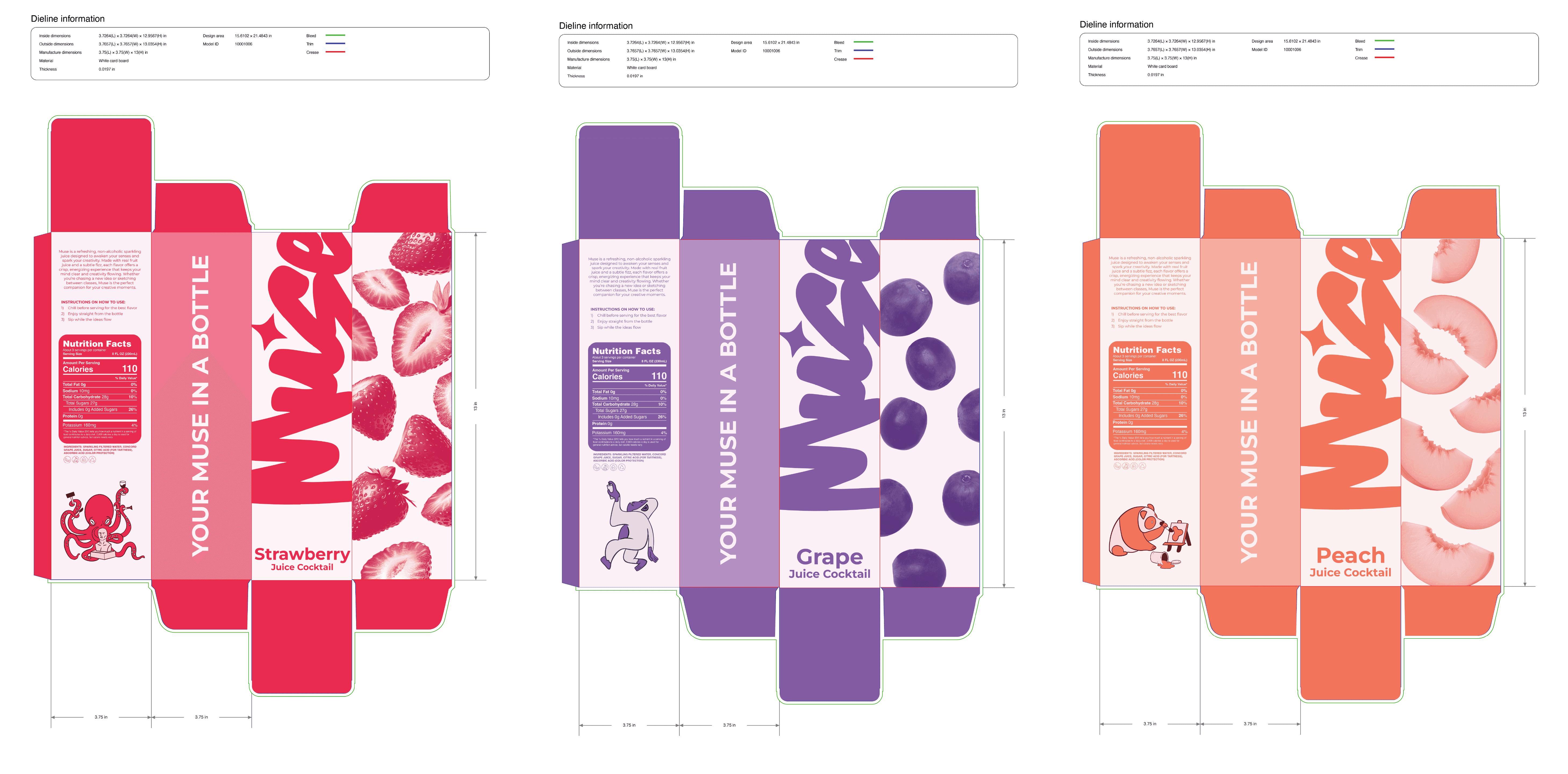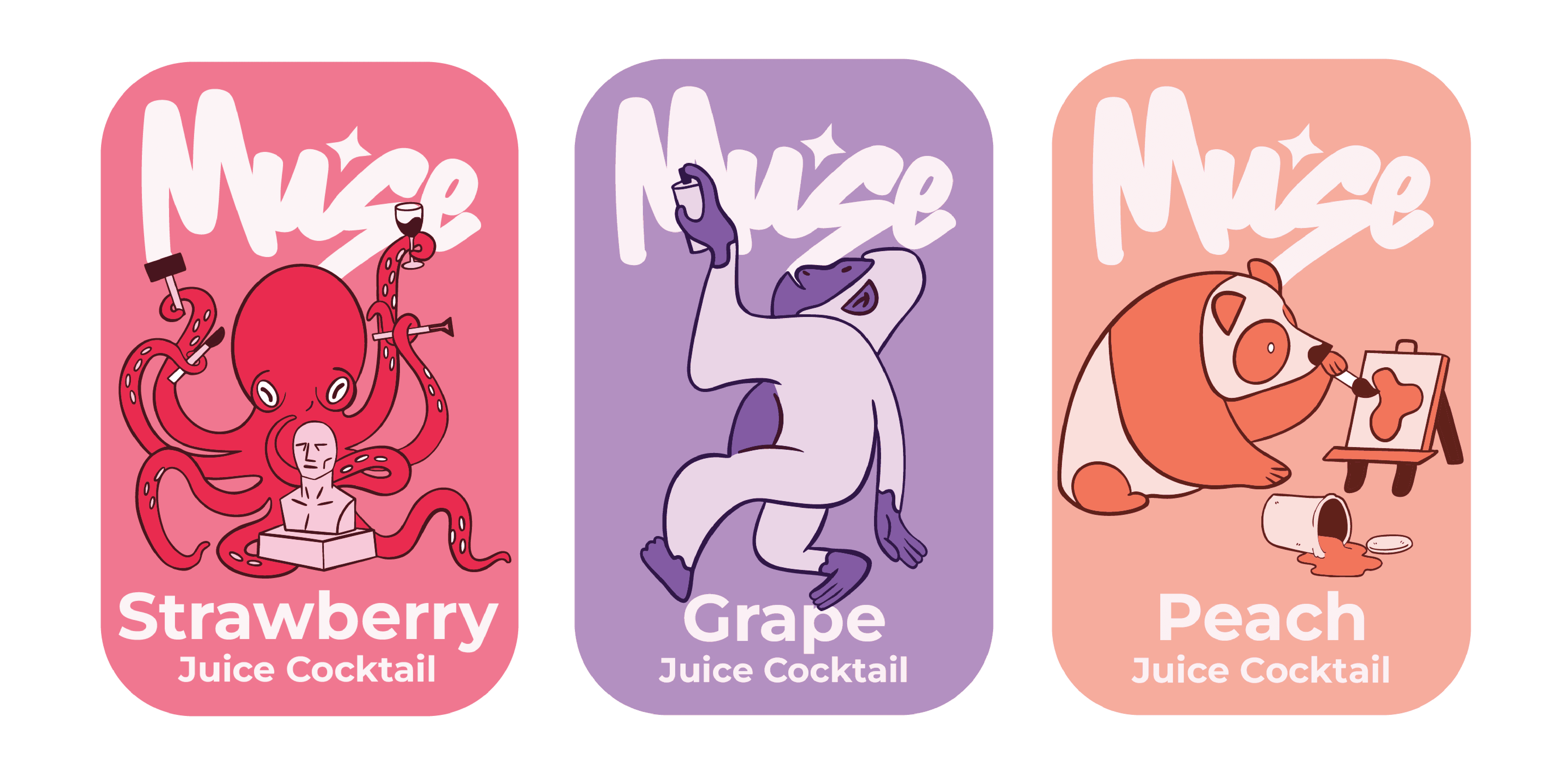 The illustrations follow a playful, character-focused style, featuring animals practicing different applied arts. A squid as a sculptor represents the strawberry flavor, a panda as a painter brings the peach flavor to life, and a graffiti-making gorilla embodies the grape flavor. The connection between each animal and its art form was intentional, linking the first letter of the flavor, the creature, and the creative practice together.