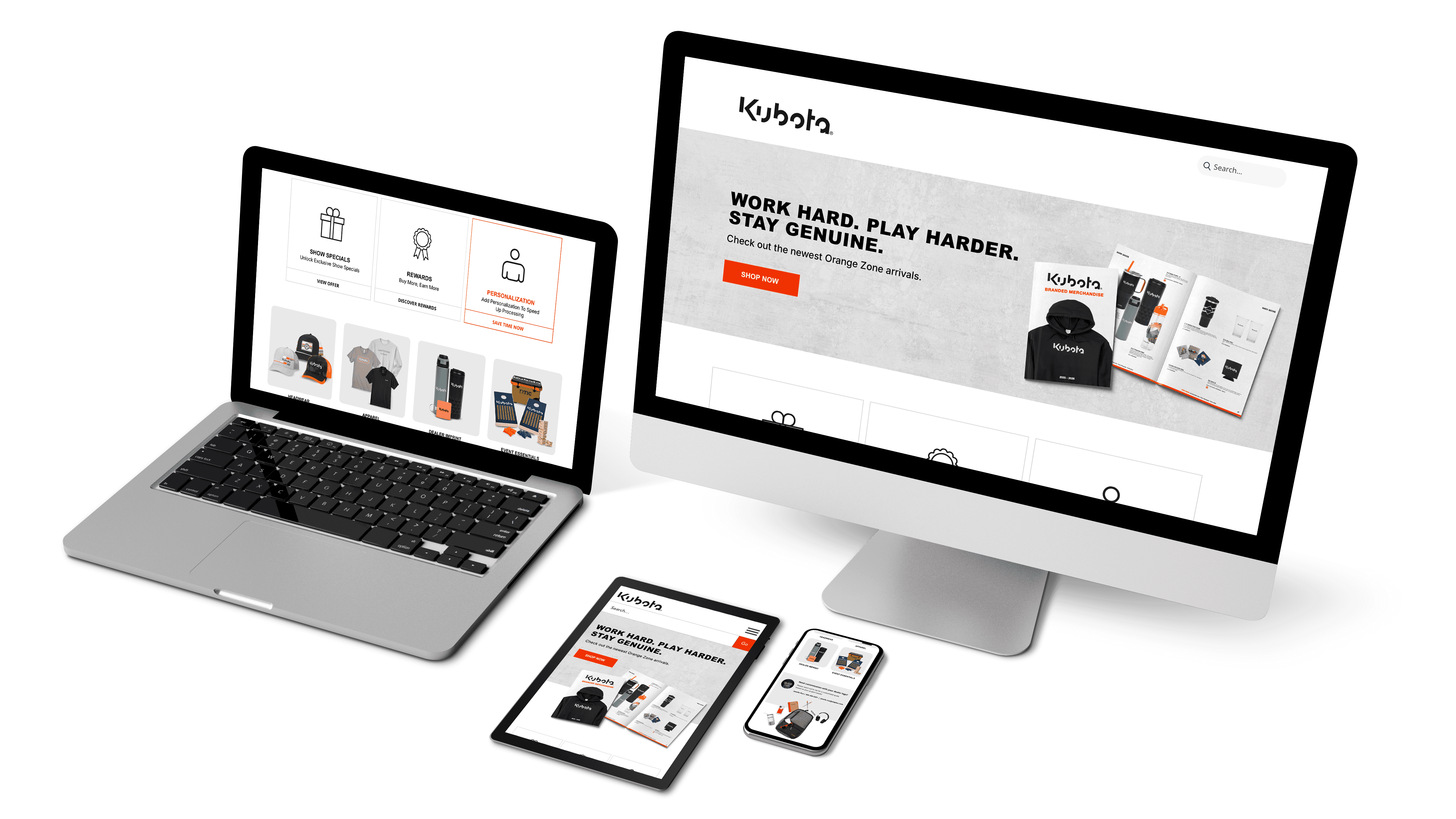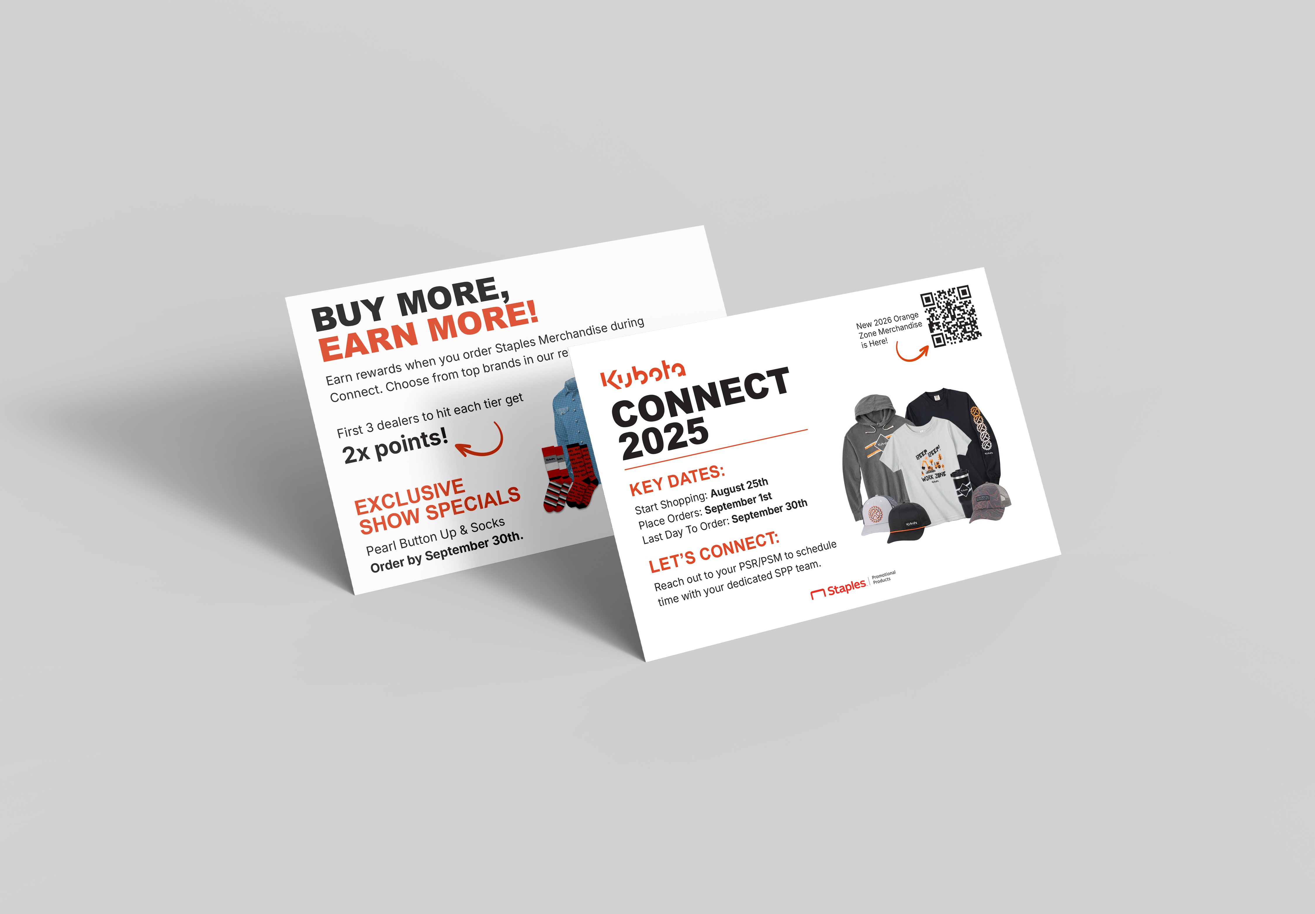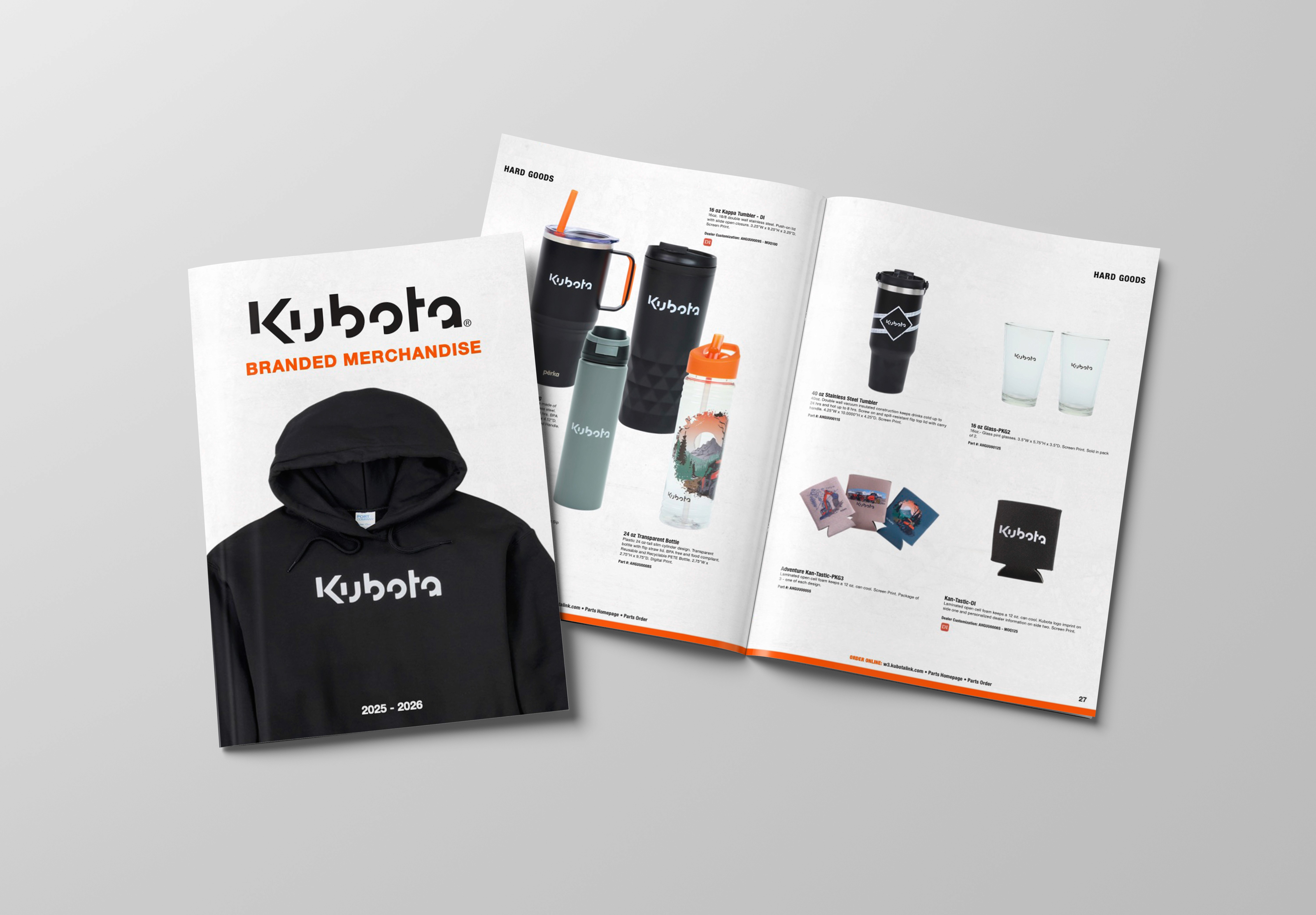 Creative work for Kubota, including the design of their annual branded merchandise catalog, a prototype for a “Shop All” page for the Kubota Gear Store, and a promotional postcard for the Kubota Connect 2025 event.