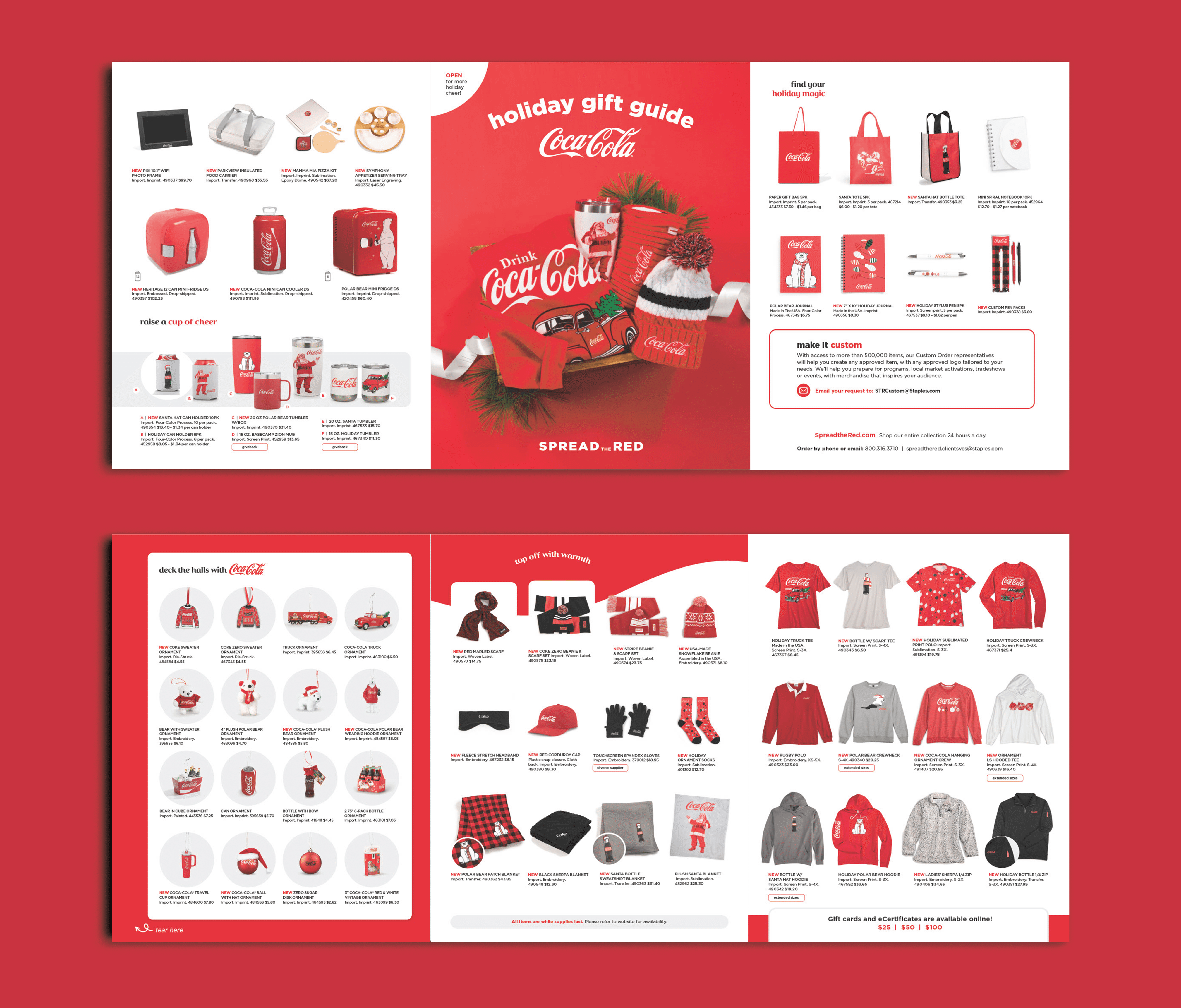 Holiday merchandise catalog designed for Coca-Cola, showcasing seasonal products, gifting options, and festive branded apparel.