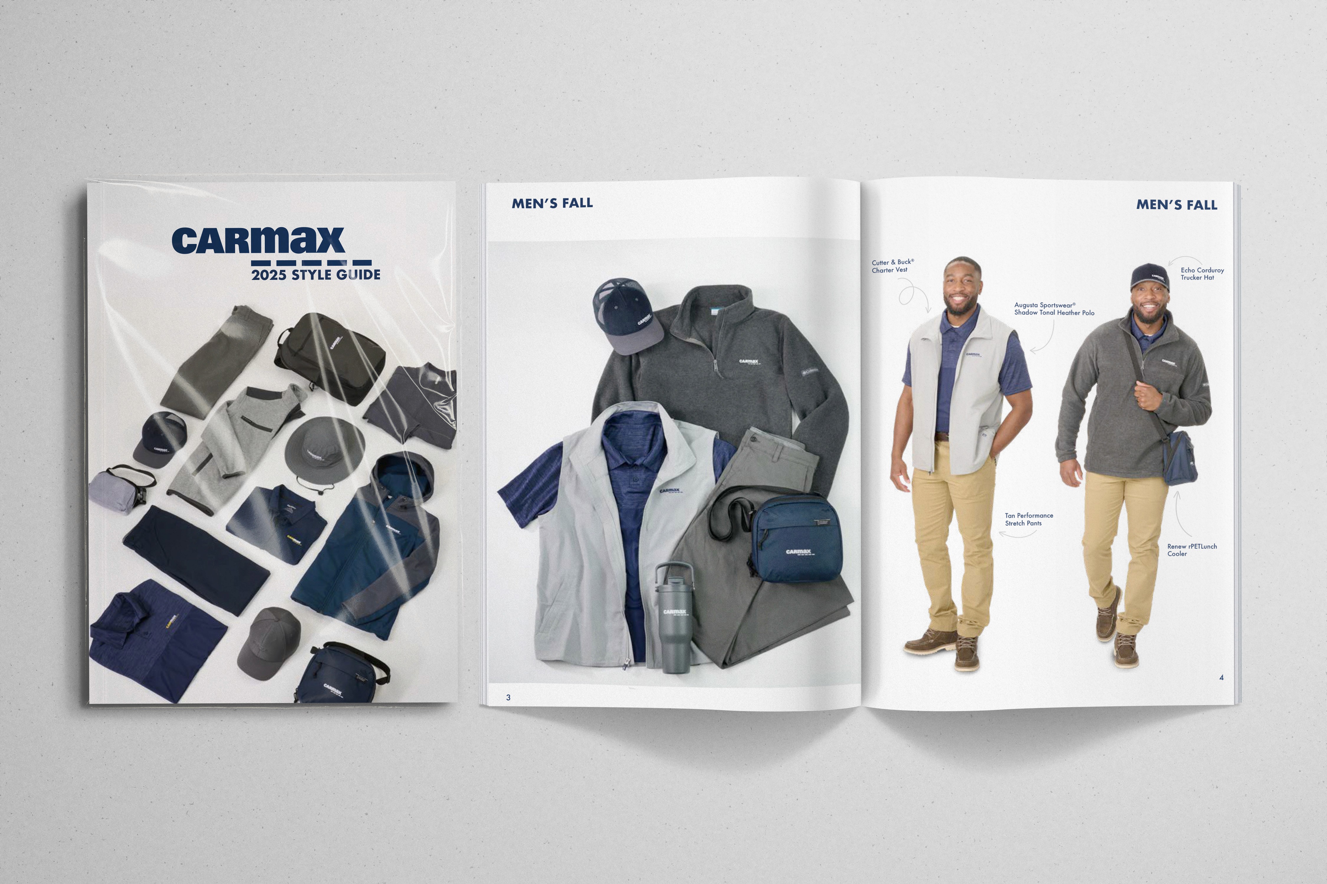 Style guide catalog created for CarMax, outlining branded merchandise options for employees and providing clear guidelines for selecting, customizing, and ordering gear.