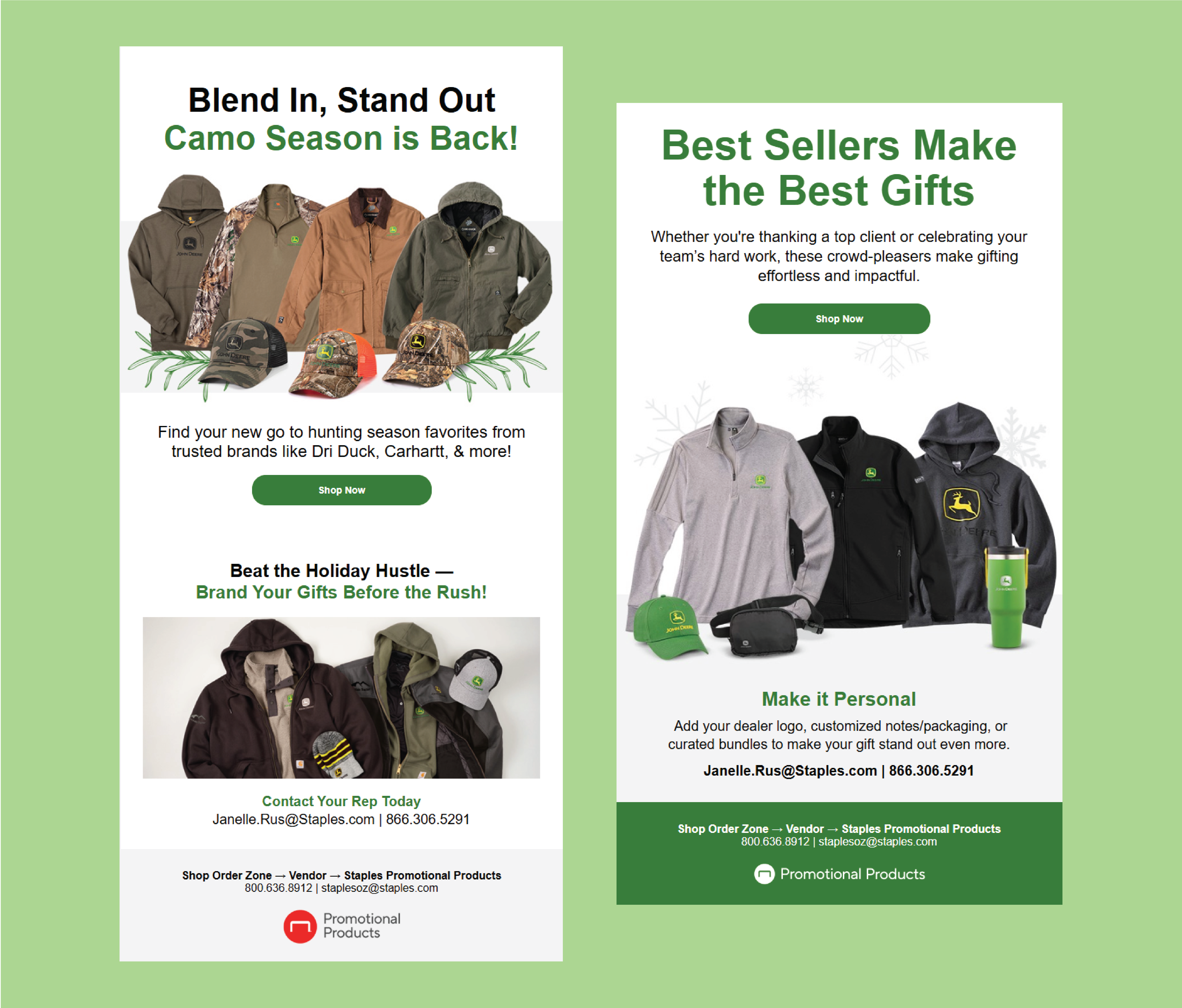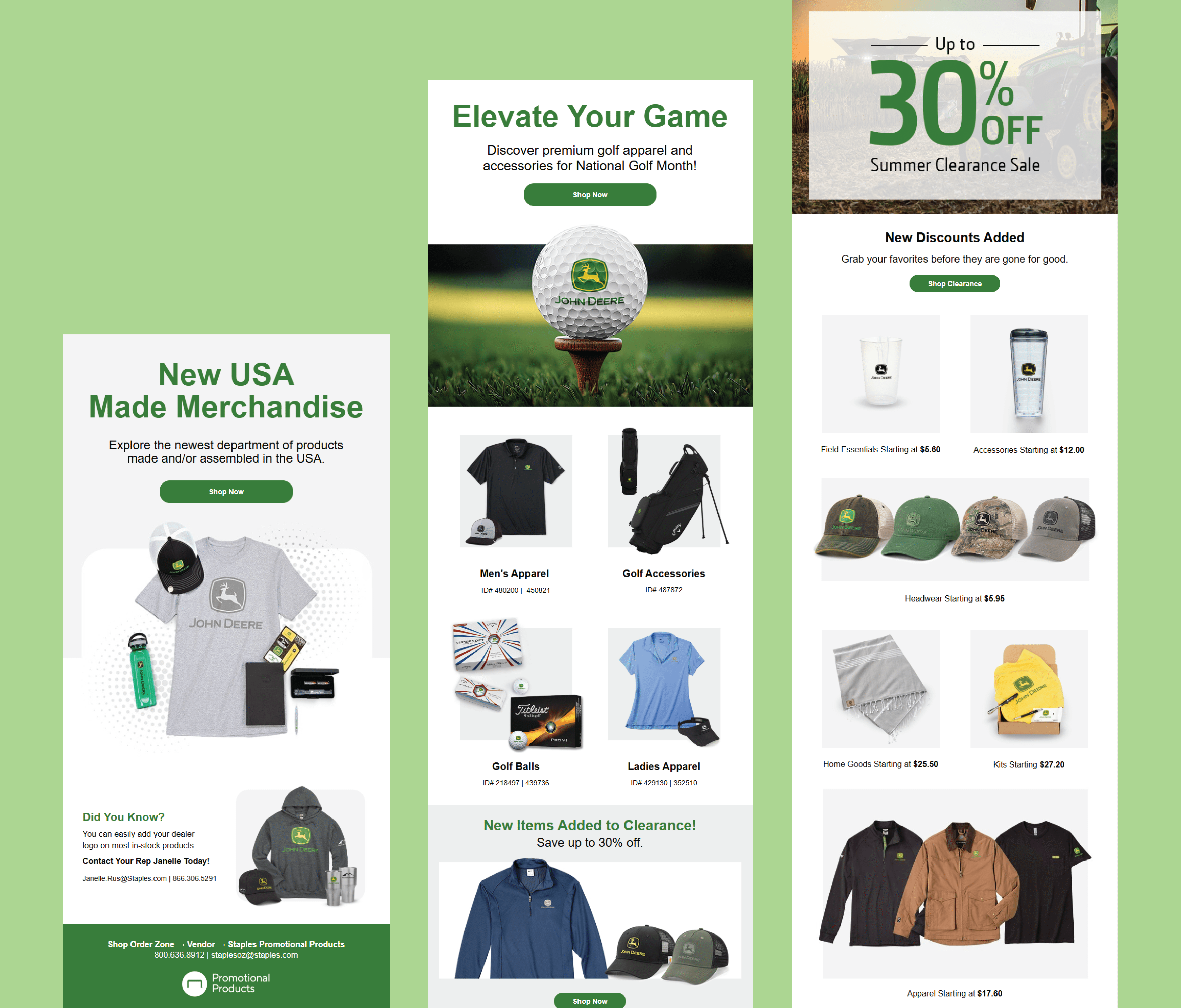Email advertisements created for John Deere, featuring promotional messaging, product highlights, and branded visuals for upcoming campaigns.