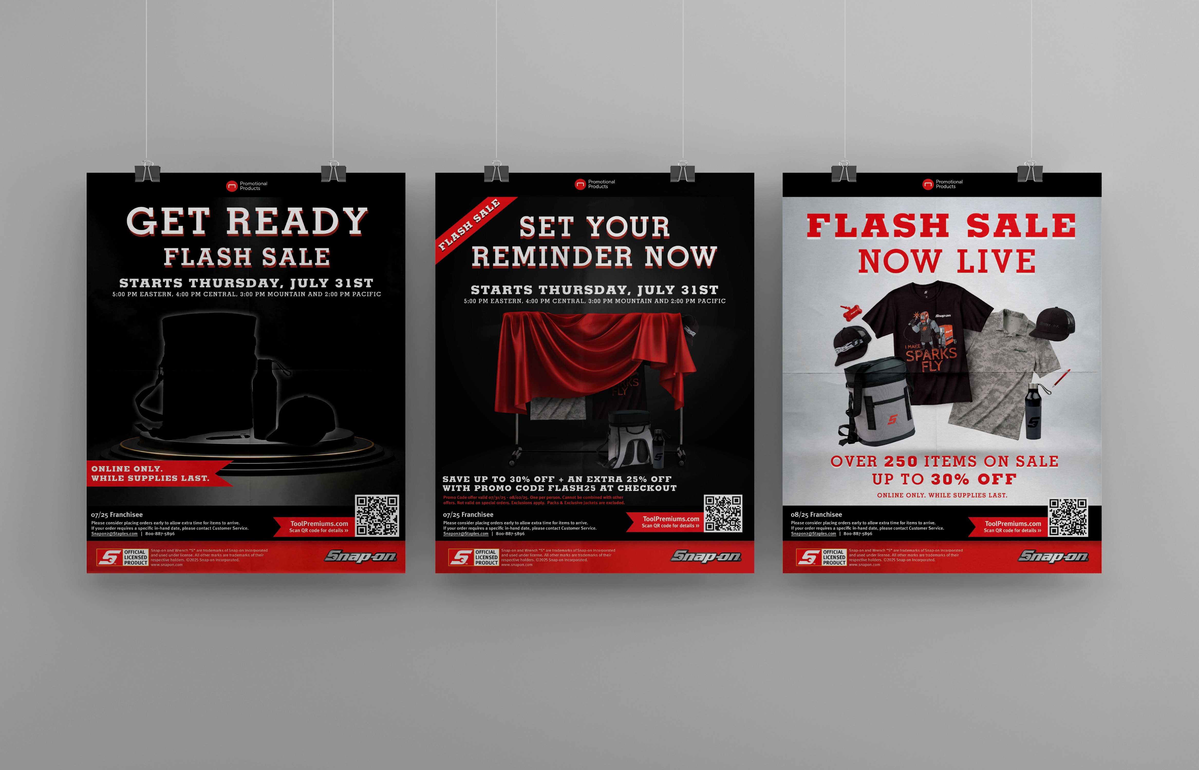 Promotional flyer series created for Snap-on, teasing the release of branded merchandise and highlighting upcoming sale.